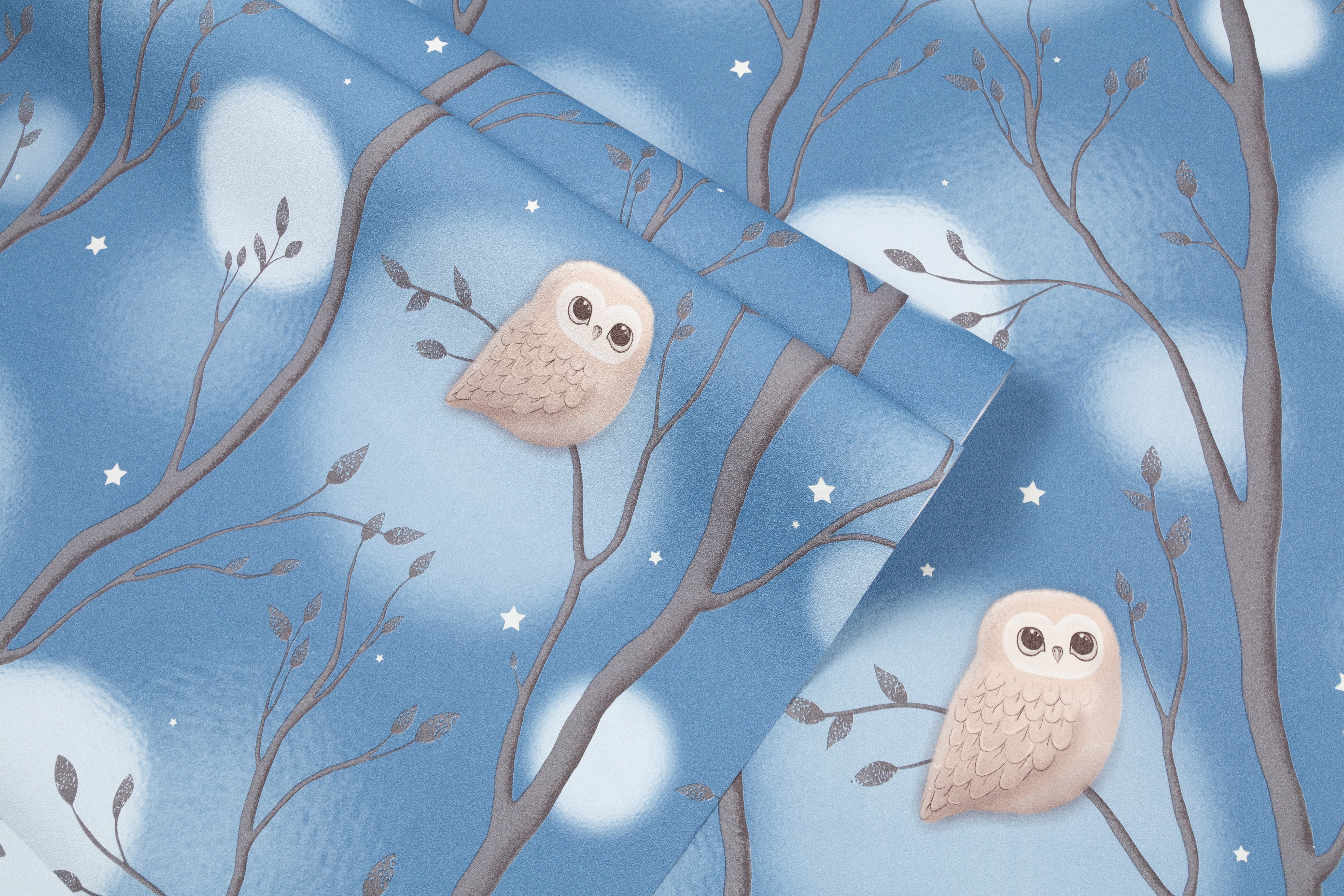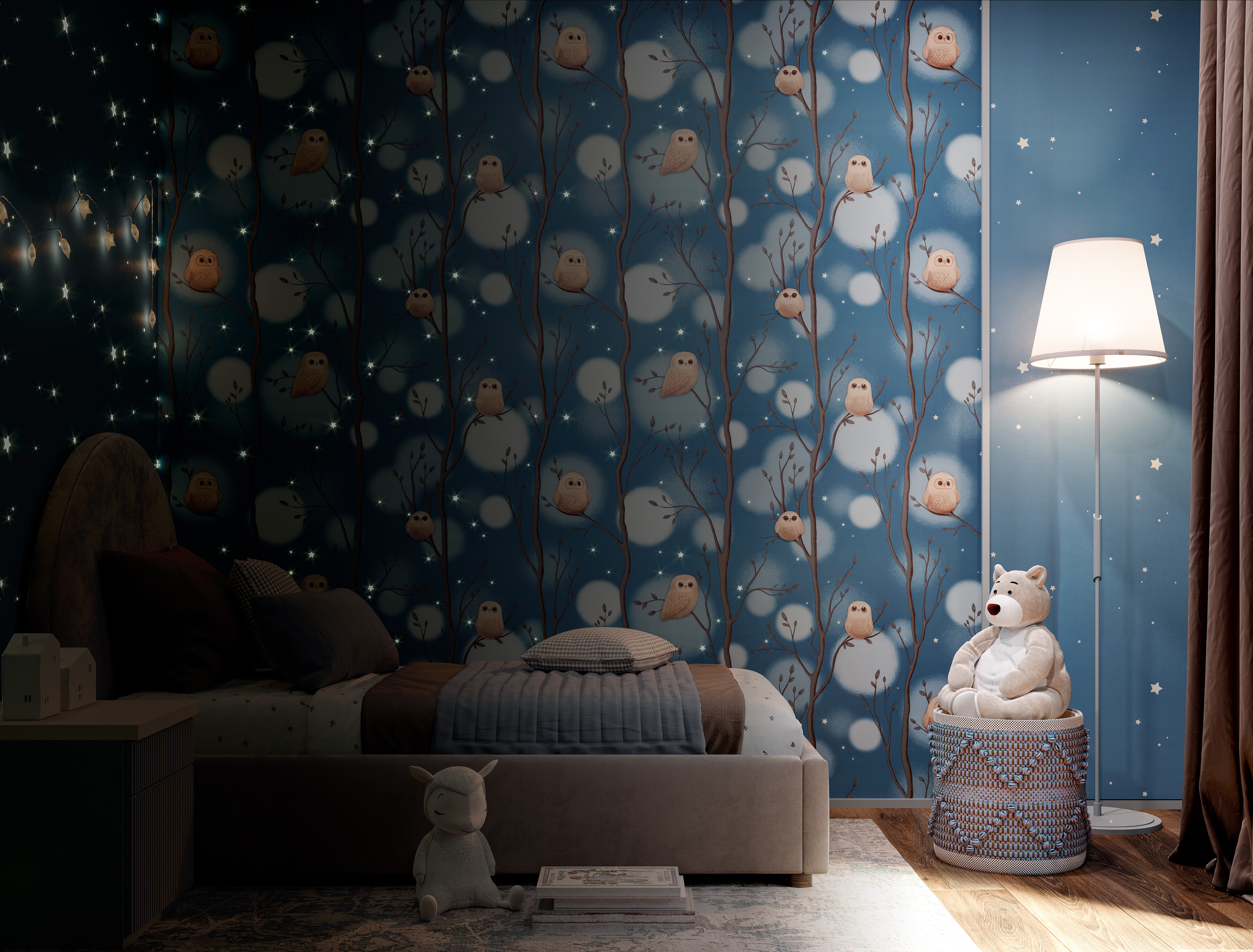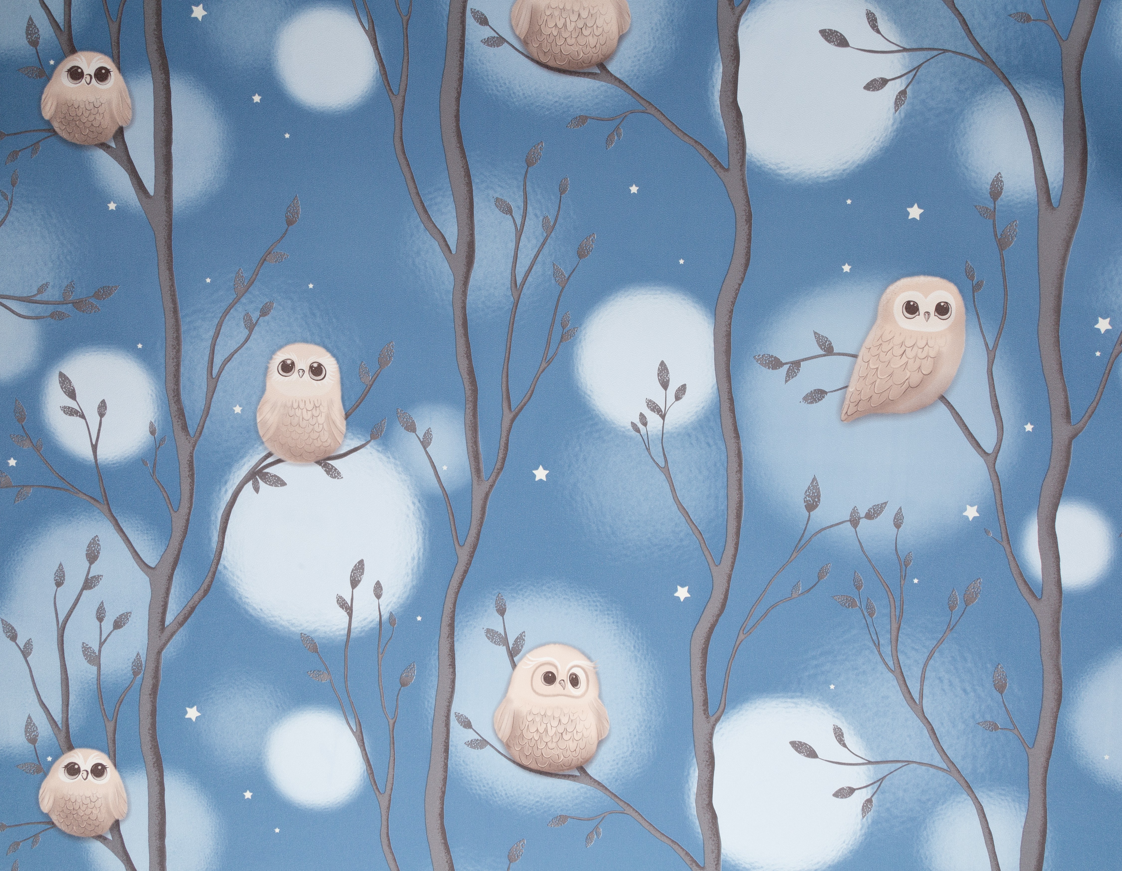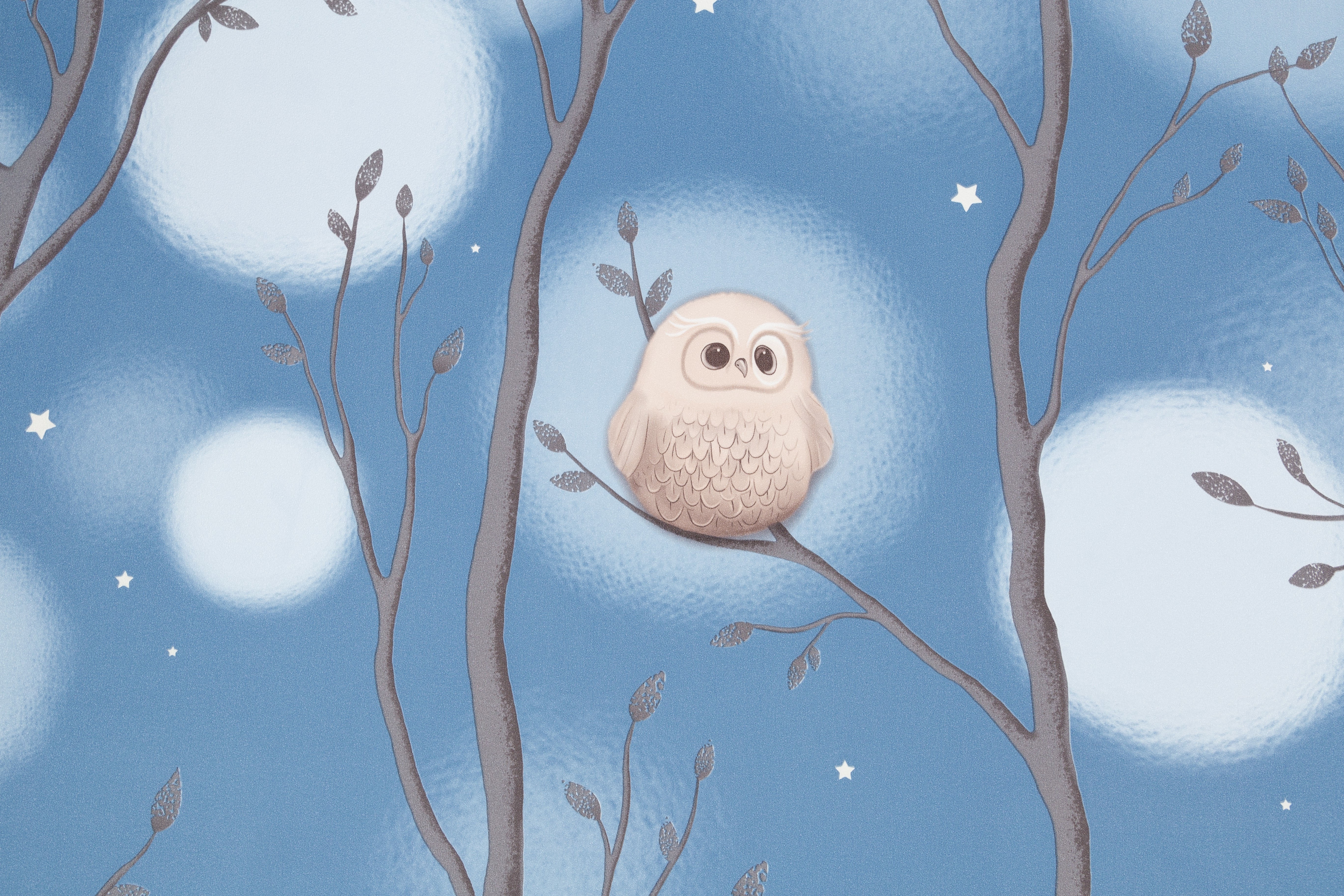 Dream - авторский сюжет для детей  Волшебное свечение в темноте¶Коллекция Dream уносит в сказочный мир детских мечтаний, где можно совершить фантастическое путешествие по чудесному лесу. Здесь живут милые и очаровательные совята, а веселые звездочки на мотиве и фоне волшебно светятся в темноте. Мимимишный эффект пушистости Пушистые воздушные шары-светлячки, которые мягко выплывают из туманной дымки, обволакивают пространство уютом. Они гармонично переплетаются с плавными ветвями деревьев и маленькими мультяшными совушками, образуя многоплановый рисунок. Мягкие уравновешенные цвета Сбалансированная палитра состоит из спокойных пастельных оттенков – устричного и моккачино. Они создают нейтральный фон в комнате и помогают лучше восстановить силы. А добавляют яркости и заряжают эмоциями энергичные ультрамариновый и васильковый. Трогательная бархатистая фактура Бархатистую поверхность обоев приятно рассматривать и гладить руками. Текстуру можно мыть влажной губкой, поэтому с нее легко удалить детские рисунки карандашом или фломастером. Фон клеится без подгона в любом направлении Компаньон со звездочками клеится без подгона и в любом направлении. А при оклеивании потолка компаньон превратится в красивое звездное небо. Обои напечатаны экологичными и безопасными материалами, имеется сертификат Роспотребнадзора.