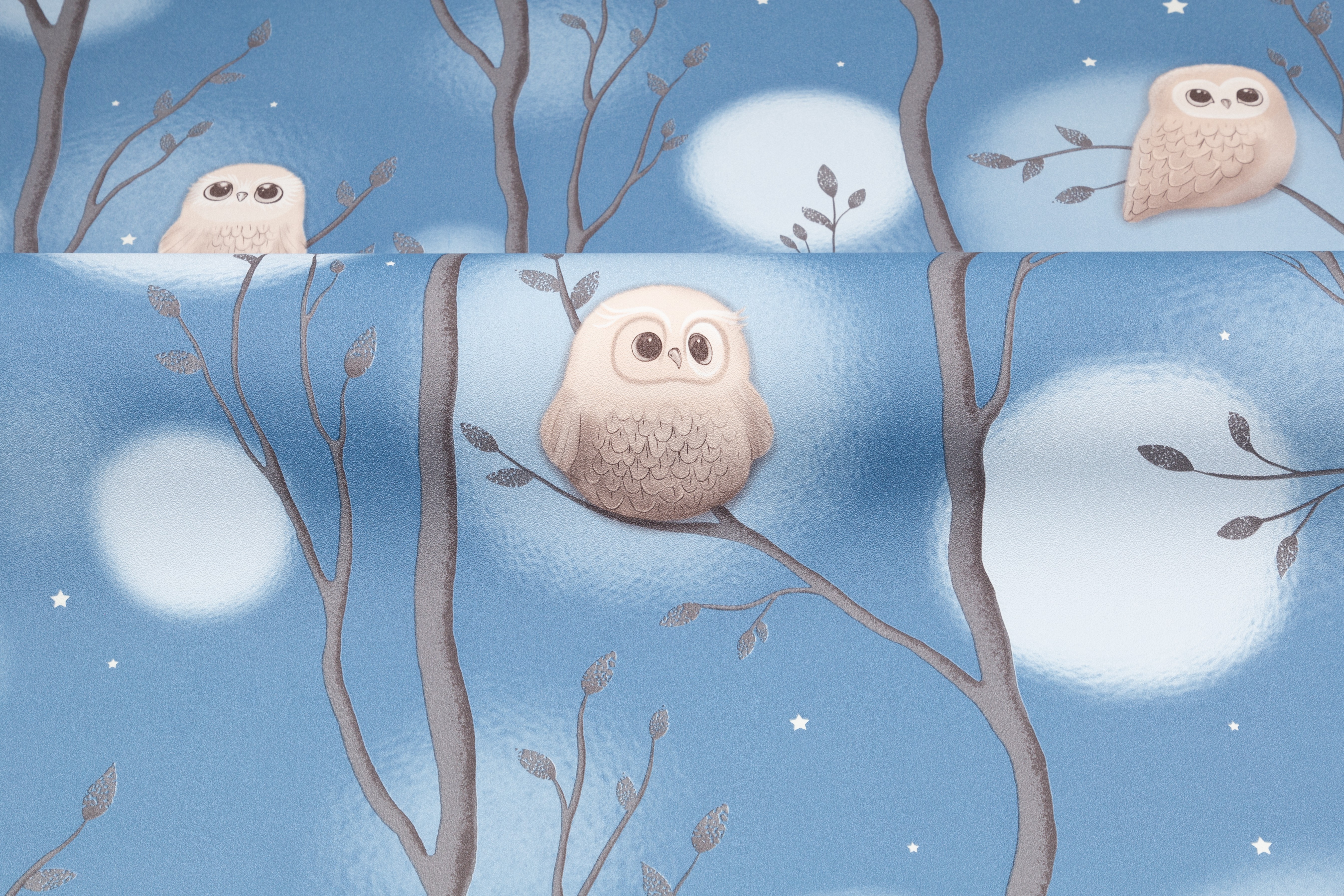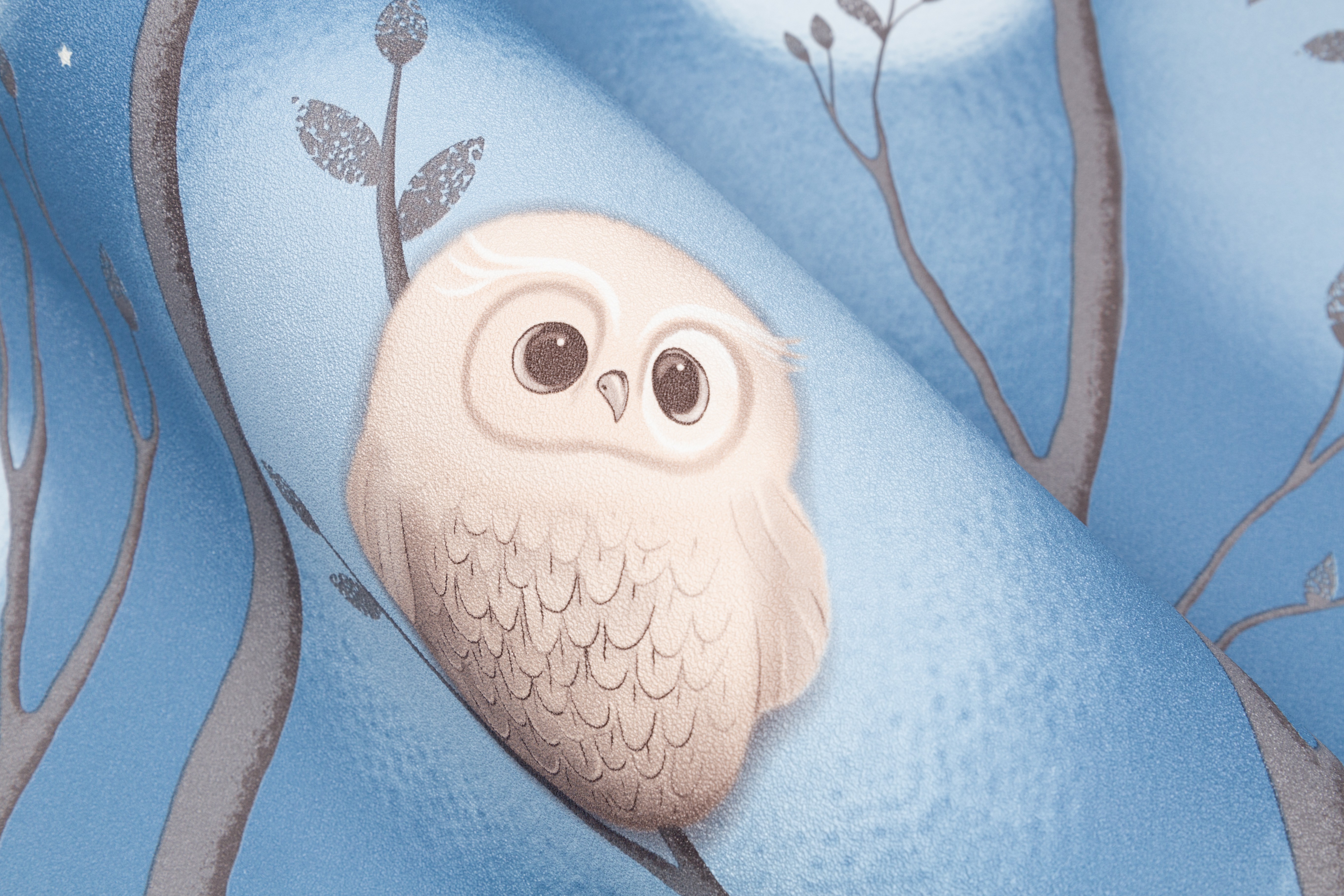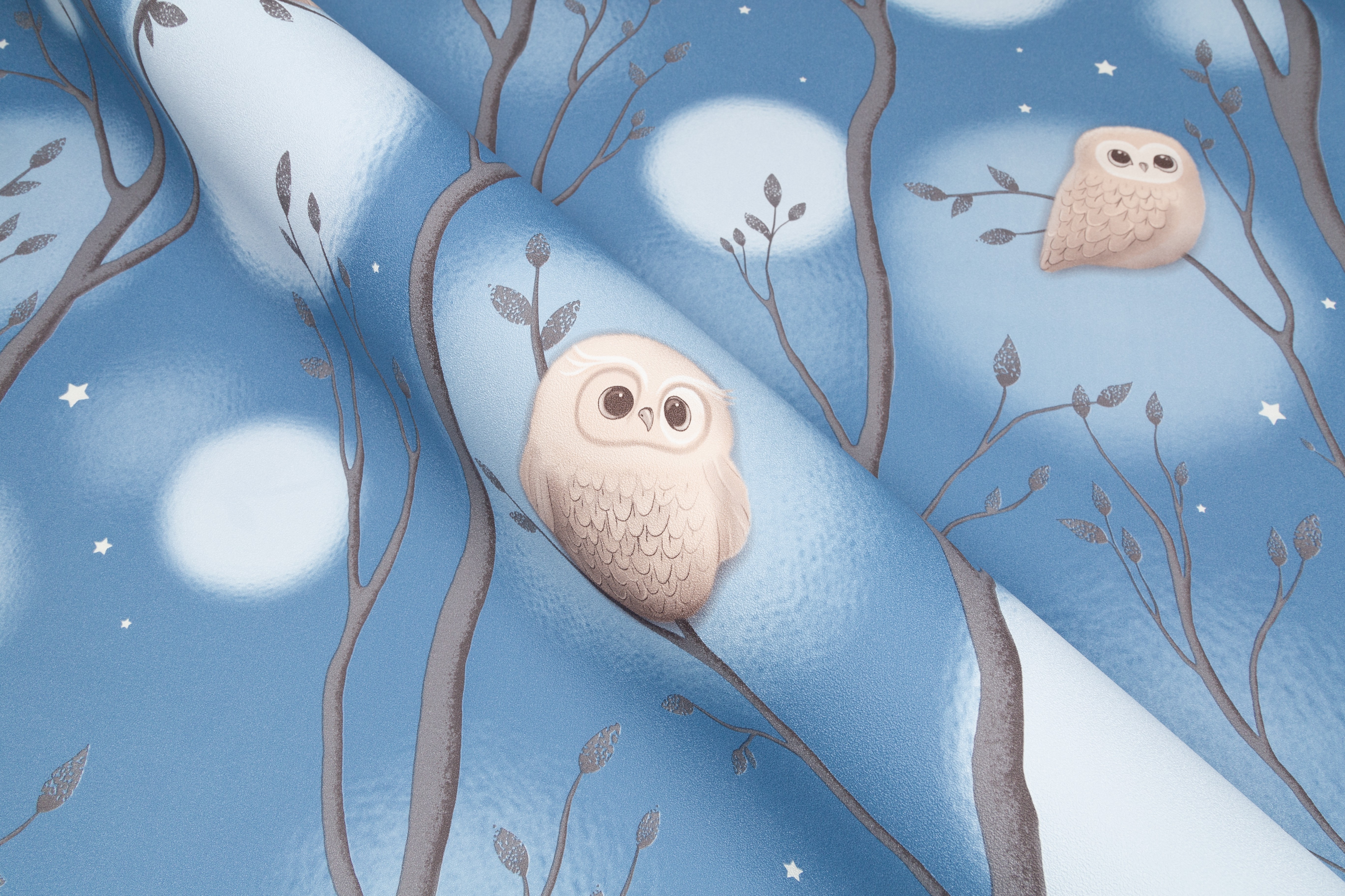 Dream - авторский сюжет для детей  Волшебное свечение в темноте¶Коллекция Dream уносит в сказочный мир детских мечтаний, где можно совершить фантастическое путешествие по чудесному лесу. Здесь живут милые и очаровательные совята, а веселые звездочки на мотиве и фоне волшебно светятся в темноте. Мимимишный эффект пушистости Пушистые воздушные шары-светлячки, которые мягко выплывают из туманной дымки, обволакивают пространство уютом. Они гармонично переплетаются с плавными ветвями деревьев и маленькими мультяшными совушками, образуя многоплановый рисунок. Мягкие уравновешенные цвета Сбалансированная палитра состоит из спокойных пастельных оттенков – устричного и моккачино. Они создают нейтральный фон в комнате и помогают лучше восстановить силы. А добавляют яркости и заряжают эмоциями энергичные ультрамариновый и васильковый. Трогательная бархатистая фактура Бархатистую поверхность обоев приятно рассматривать и гладить руками. Текстуру можно мыть влажной губкой, поэтому с нее легко удалить детские рисунки карандашом или фломастером. Фон клеится без подгона в любом направлении Компаньон со звездочками клеится без подгона и в любом направлении. А при оклеивании потолка компаньон превратится в красивое звездное небо. Обои напечатаны экологичными и безопасными материалами, имеется сертификат Роспотребнадзора.